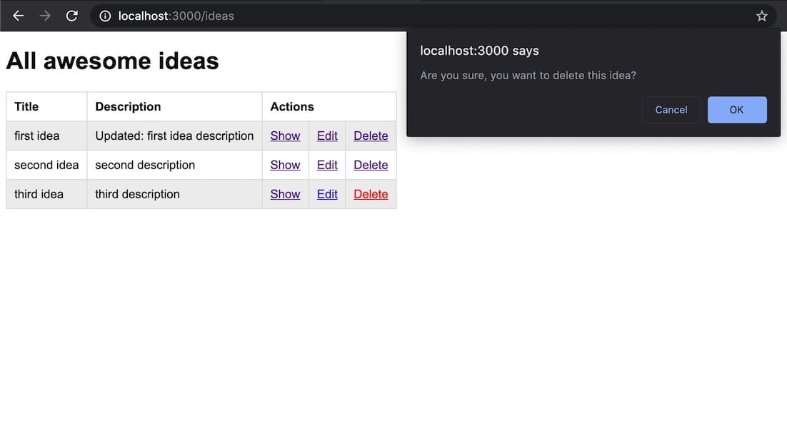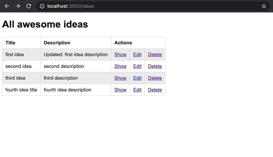 On reloading the ideas index page, https://localhost:3000/ideas, you will see following: