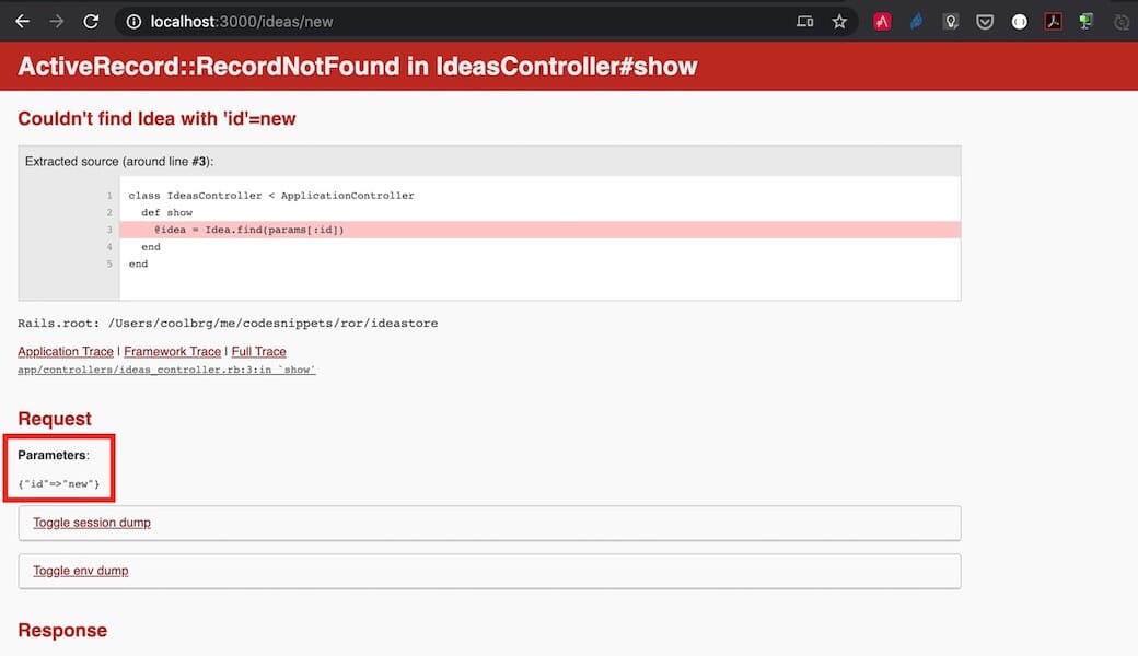 The root reason here is that since we have only two routes i.e index and show which maps to /ideas and /ideas/:id respectively, when we hit URL /ideas/new, Rails basically assume that we are looking for idea with id new.