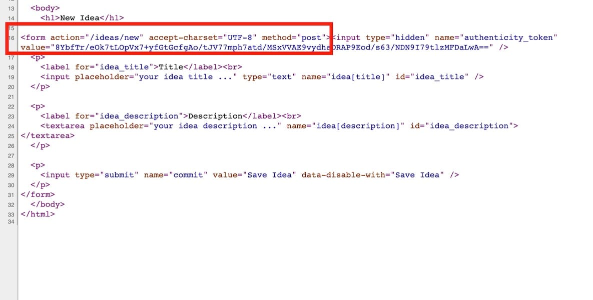 Update the form in app/views/ideas/new.html.erb by adding url: ideas_path and check the page source again.